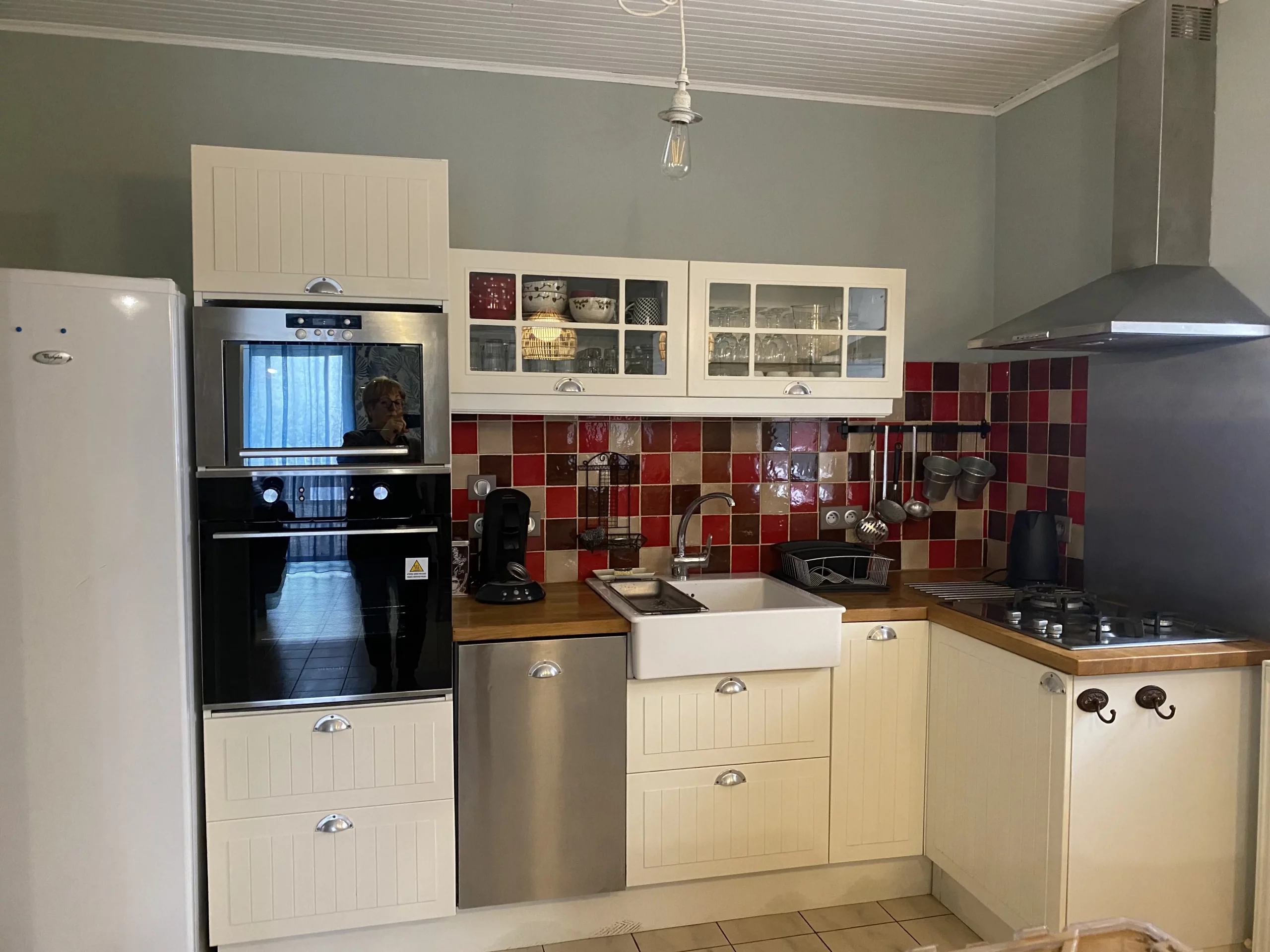 3 plaques gaz, micro-ondes, four, réfrigérateur-congélateur américain, lave-vaisselle. Vaisselle pour 10 personnes. Autocuiseur, cafetière électrique, cafetière Senseo, grille-pain, mixeur, bouilloire. Vous trouverez également dans la maison un aspirateur ainsi qu’un fer à repasser.